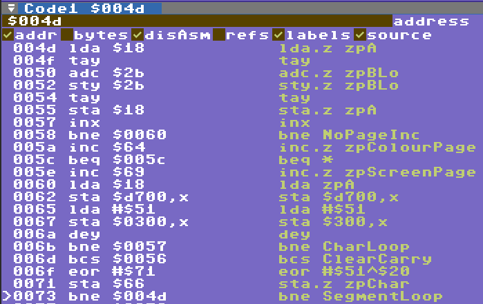 So this looks a little more like mine, but interestingly not using indexed writes for screen and color but incrementing both low and high bytes of the addresses. Code looks very readable too so I think it is easy to follow the code and comments to see what is going on! No basic/kernal calls and no illegals makes it even easier to read.
